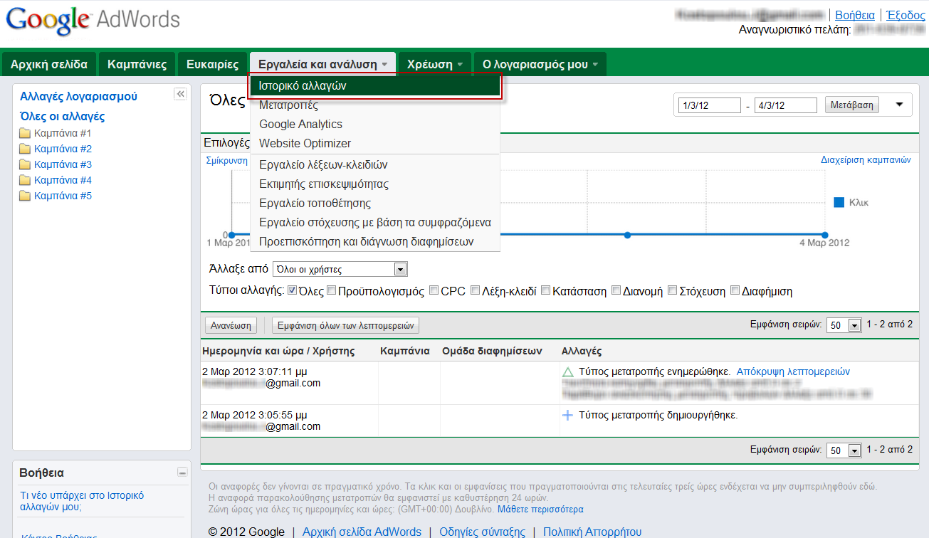Αυτό το εργαλείο σάς δίνει τη δυνατότητα να παρακολουθείτε τις αλλαγές που έχετε κάνει στο λογαριασμό σας (από την 1/1/2006), για να κατανοήσετε καλύτερα πώς οι αλλαγές αυτές επηρεάζουν την απόδοση της καμπάνιας σας.