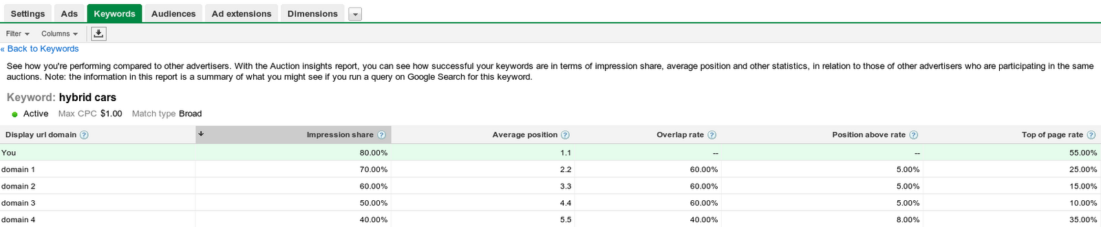 Με την αναφορά πληροφοριών δημοπρασίας, μπορείτε να συγκρίνετε την απόδοσή σας με αυτήν των άλλων διαφημιζομένων που συναγωνίζονται στο ίδιο σύνολο δημοπρασιών με εσάς. Μπορείτε να δείτε πόσο συχνά οι διαφημίσεις σας εμφανίζονται σε υψηλότερη κατάταξη στη σελίδα αποτελεσμάτων αναζήτησης σε σχέση με τις διαφημίσεις των άλλων διαφημιζομένων, καθώς και τη συχνότητα των εμφανίσεων των δικών σας διαφημίσεων σε σύγκριση με τις δικές τους με βάση τις δικές σας εκτιμώμενες πιθανές εμφανίσεις. Αυτή η πληροφορία θα σας βοηθήσει στη λήψη στρατηγικών αποφάσεων σχετικά με προσφορές, προϋπολογισμούς και επιλογές λέξεων-κλειδιών επισημαίνοντας τα σημεία όπου έχετε μια επιτυχημένη παρουσία και τα σημεία όπου ίσως αφήνετε ανεκμετάλλευτες ευκαιρίες για βελτιωμένη απόδοση.