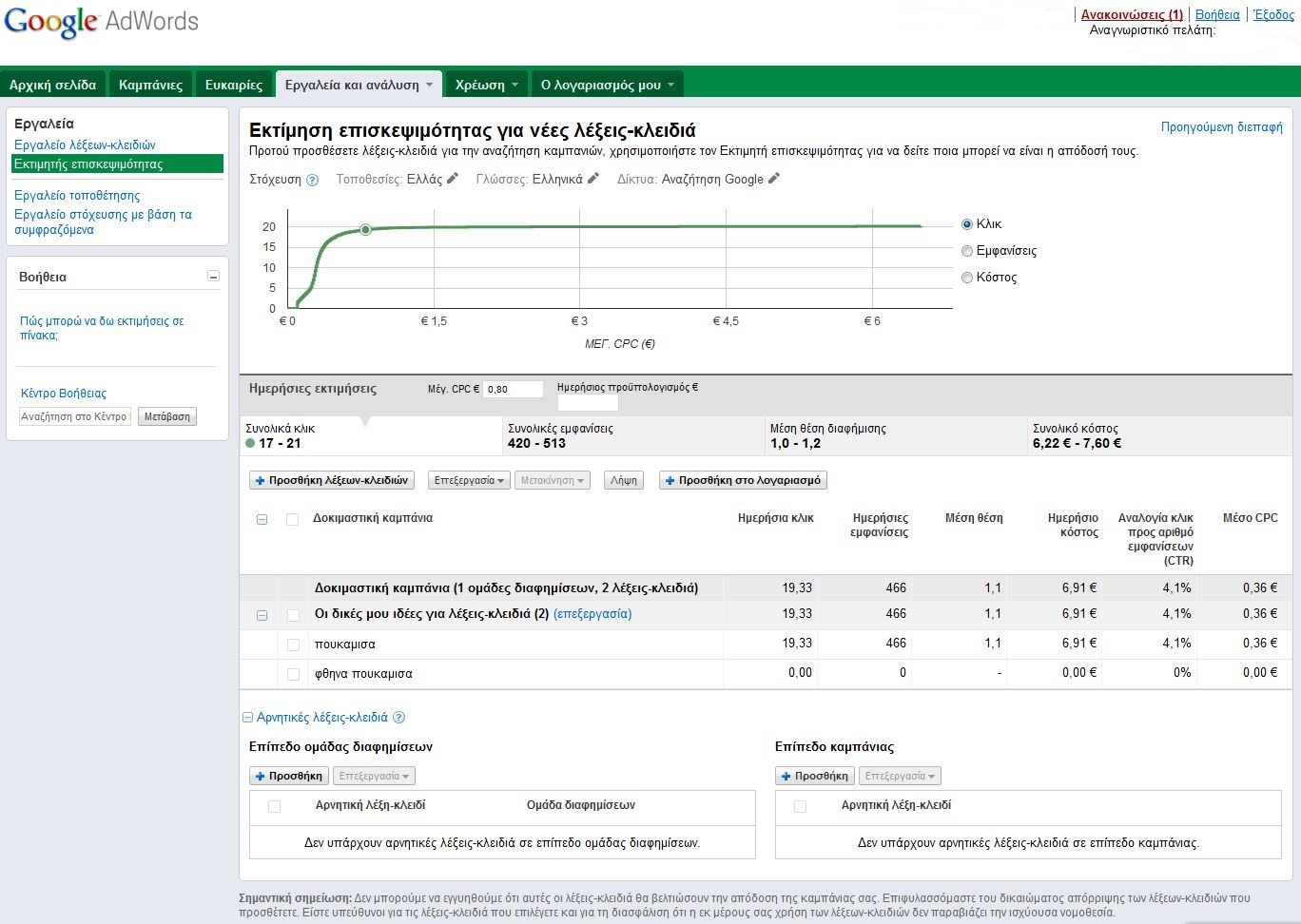 Θα βρείτε το ενημερωμένο Εργαλείο λέξεων-κλειδιών και τον Εκτιμητή επισκεψιμότητας στη διεπαφή του AdWords μέσα στις επόμενες εβδομάδες. Για να μάθετε περισσότερα σχετικά με τις ενημερώσεις στο Εργαλείο λέξεων-κλειδιών, επισκεφτείτε αυτό το άρθρο στο Κέντρο Βοήθειας και επισκεφτείτε το άρθρο Χρήση του Εκτιμητή επισκεψιμότητας για πρόβλεψη της απόδοσης για να μάθετε περισσότερα σχετικά με τον Εκτιμητή επισκεψιμότητας.