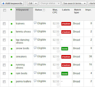 Τώρα πια, ο Αναστάσης μπορεί να δημιουργήσει την ετικέτα "αθλητικά παπούτσια" και να την εφαρμόσει σε όλες τις λέξεις-κλειδιά που σχετίζονται με αθλητικά παπούτσια σε ολόκληρο το λογαριασμό του. Μπορεί, στη συνέχεια, να χρησιμοποιήσει ως φίλτρο αυτήν την ετικέτα στην καρτέλα "Λέξεις-κλειδιά" για να δει μόνο τις λέξεις-κλειδιά που σχετίζονται με αθλητικά παπούτσια ή μπορεί να εκτελέσει μια αναφορά ετικετών λέξεων-κλειδιών για να συγκεντρώσει την απόδοση ανά ετικέτα. Αυτές οι αναφορές τού επιτρέπουν να συγκρίνει - για παράδειγμα - την απόδοση των αθλητικών παπουτσιών σε σχέση με την απόδοση όλων των υπόλοιπων παπουτσιών ή άλλων ομάδων που φέρουν ετικέτα.